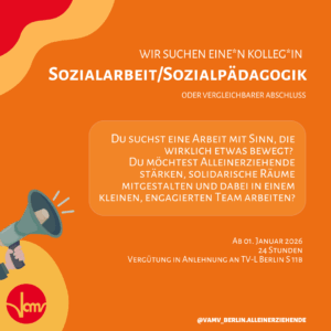Kolleg*in mit einem Abschluss in Sozialarbeit/Sozialpädagogik (B.A.) für die Pädagogische Mitarbeit beim VAMV Berlin gesucht.