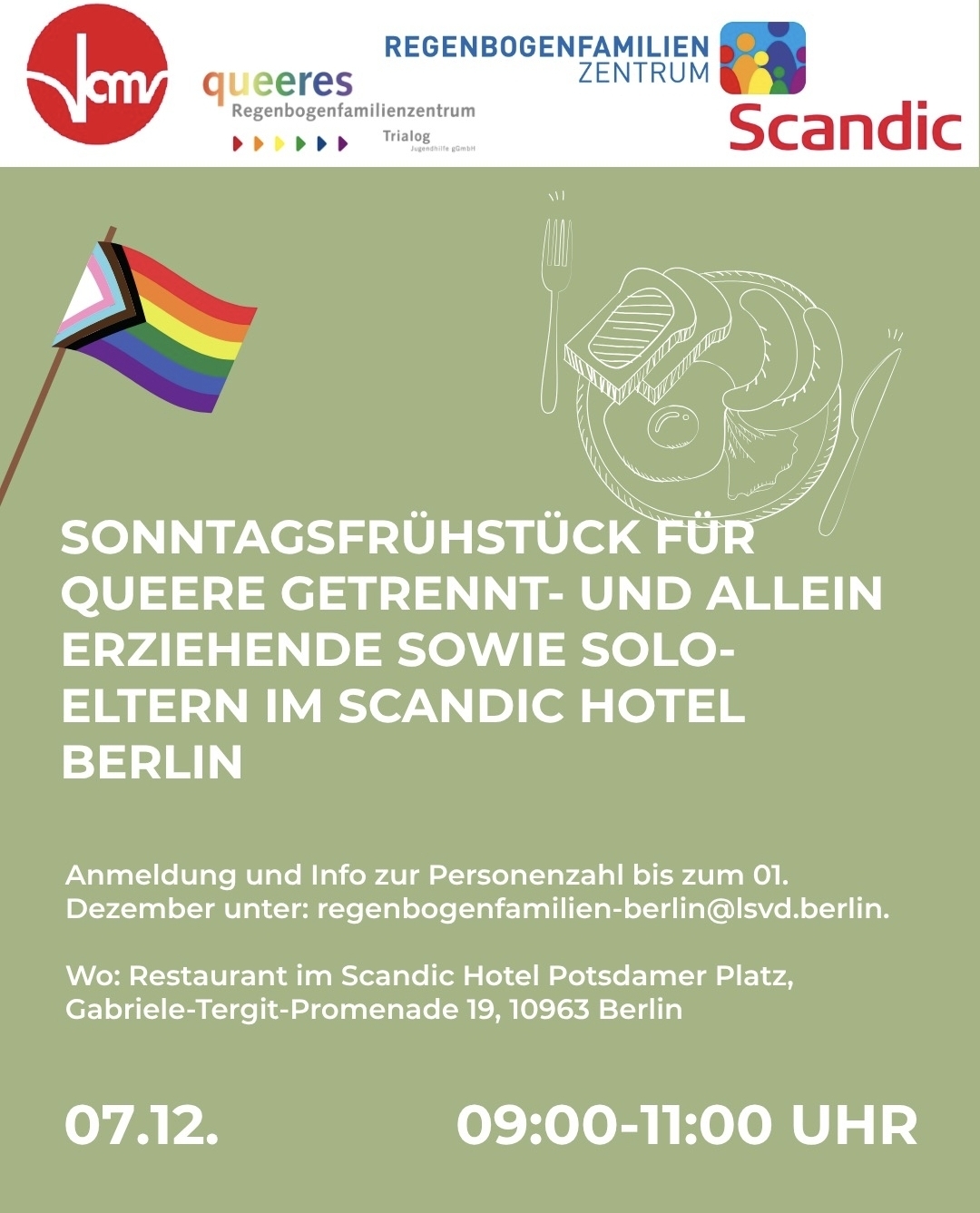 Das Event ist eine Kooperation des Regenbogenfamilienzentrum Schöneberg, dem queeren Regenbogenfamilienzentrum in Berlin Ost, dem Verband alleinerziehender Mütter und Väter Landesverband Berlin e.V. (VAMV Berlin) und dem Scandic Berlin Hotel.
